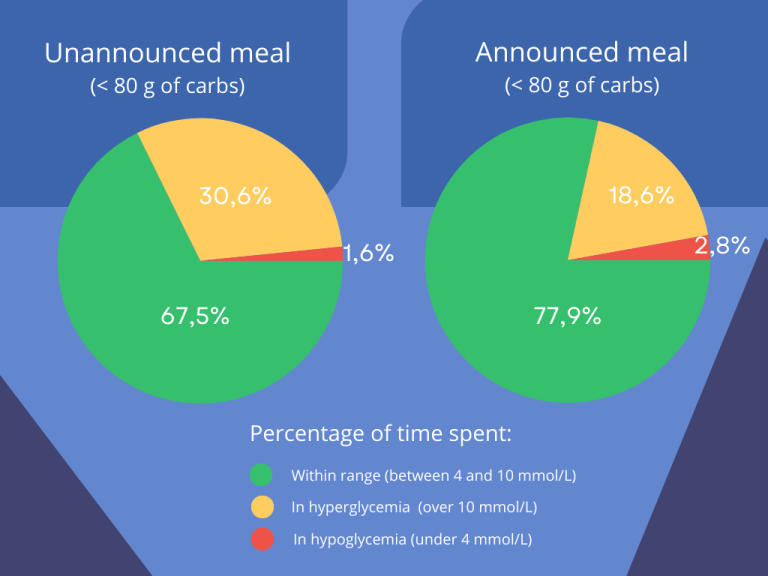 However, it’s important to remember that these systems are not completely self-sufficient. You need to manually enter into the pump the number of carbs you’re going to eat, so that the algorithm can calculate the required bolus for your meal. If you omit or forget to announce your meal to your pump, there’s an obvious risk of significant hyperglycemia because you won’t receive the required insulin dose beforehand.